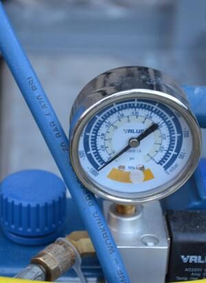 Kolejną czynnością jest zrobienie próżni. Po zejściu wskazówki na manometrze pompy próżniowej poniżej 0 bar, próżnia powinna być wykonywana jeszcze przez min.30 min.