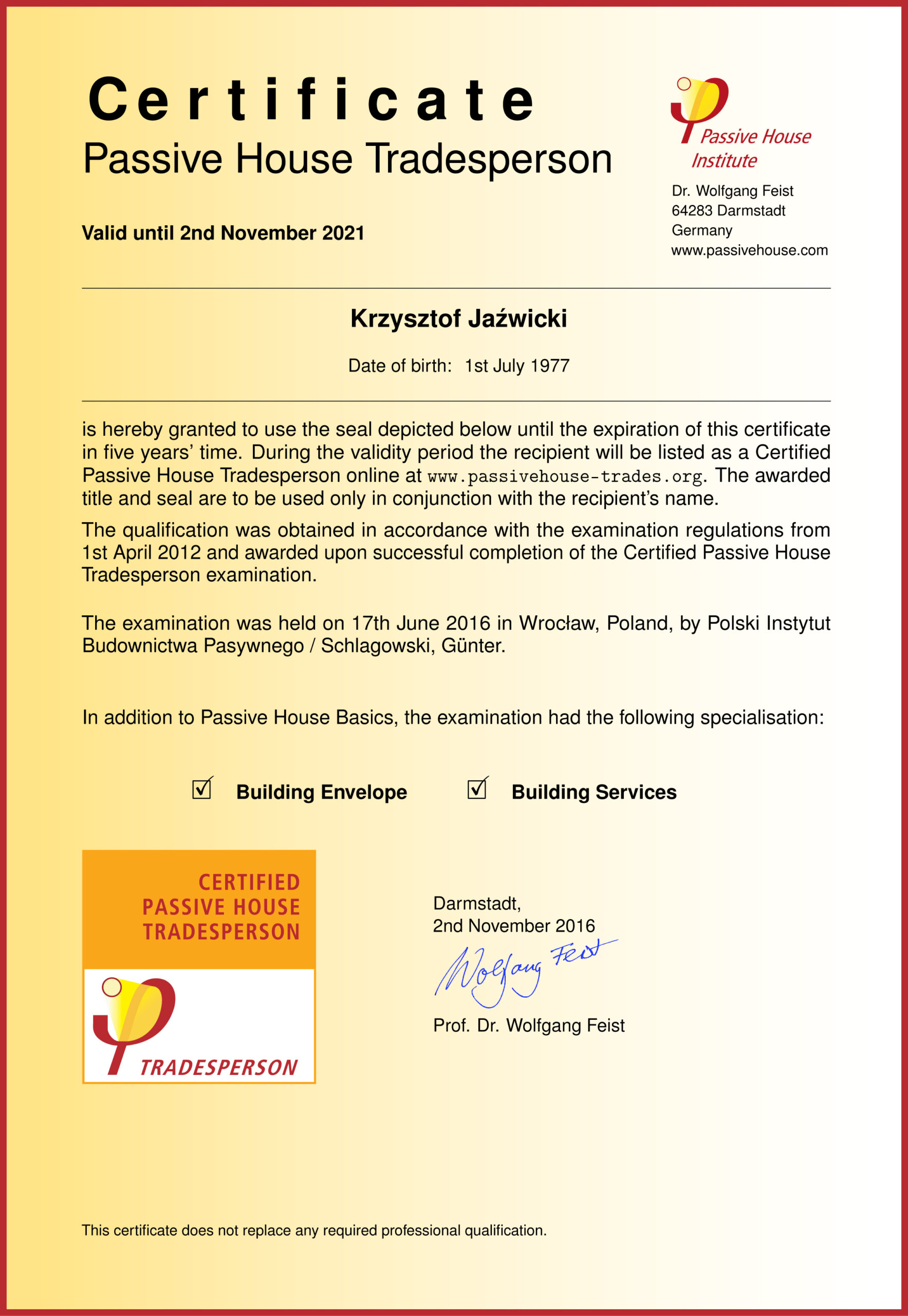 Posiadamy wiele certyfikatów branżowych, jednak ten upragniony to Certyfikowany Mistrz/Wykonawca/Nadzorca Budownictwa Pasywnego nadawany przez Passivhaus Institut Darmstadt.